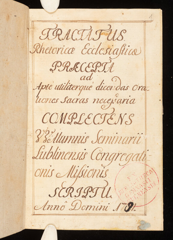 Rękopis współoprawny z drukiem Officia propria sanctorum […], Culmae Anno Domini 1772, nie notowanym przez Bibliografię polską Karola Estreichera. Zawiera podręcznik retoryki kościelnej, powstał przypuszczalnie w 1791 r. z przeznaczeniem dla alumnów seminarium Zgromadzenia Księży Misjonarzy św. Wincentego a Paulo w Lublinie.