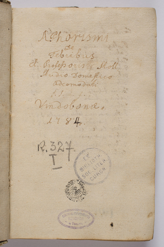 Rękopis zawiera skrót pracy austriackiego lekarza Maksymiliana Stolla, profesora Uniwersytetu we Wiedniu (1776), Aphorismi de febribus (1784). Traktat – w innej redakcji i w szerszej postaci (uzupełniony o część rozdziału o chorobach zapalnych oraz rozdział o objawach chorób), został po raz pierwszy wydany drukiem we Wiedniu w 1786 r. (Maximilian Stoll, Aphorismi de cognoscendis et curandis febribus, Vindobonae 1786). Pieczęć z inicjałami „I. W. Fr. Lieb.” należała zapewne do pierwszego właściciela rękopisu: wywodzącego się przypuszczalnie z terenów Kurlandii studenta medycyny Uniwersytetu w Rostocku (ok. poł. XVIII w.), który następnie ofiarował swój księgozbiór Towarzystwu Kurlandzkiemu w Mittawie