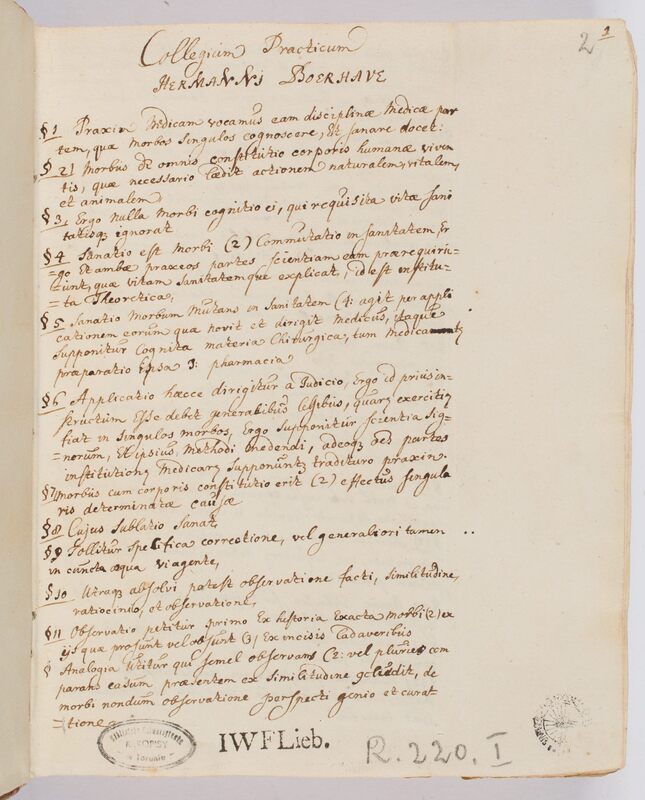 Rękopis zawiera wykład medycyny praktycznej holenderskiego lekarza Hermanna Boerhaave (1668–1738), profesora medycyny klinicznej Uniwersytetu w Lejdzie (1714–1738), jednego z najwybitniejszych medyków XVIII w. Pieczęć z inicjałami I. W. Fr. Lieb. należała zapewne do kolejnego właściciela rękopisu: wywodzącego się przypuszczalnie z terenów Kurlandii studenta medycyny Uniwersytetu w Rostocku (ok. poł. XVIII w.), który następnie ofiarował swój księgozbiór Kurlandzkiemu Towarzystu Literatury i Sztuki w Mittawie