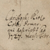 2. Charakterystyczna sygnatura biblioteki wcześniejszego właściciela, historyka Pomorza, Ludwiga Wilhelma Brüggemanna, np.: Sect. XIV.III.6.19, w której pierwsza liczba rzymska oznacza dział (sekcję), kolejna poddział, a liczby arabskie oznaczają pozycję danej książki w dziale
