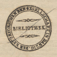 - 1. Okrągła czarna pieczątka, wewnątrz napis BIBLIOTHEK, w otoku DER NATURFORSCHENDEN GESELLSCHAFT IN DANZIG
