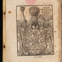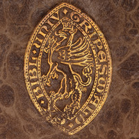 5. Superekslibris w formie mandorli z napisem wzdłuż krawędzi: EX • BIBL • UNIV • GRIPESWALD • ; w środku koronowany gryf wspięty. Tłoczenie złocone. Wymiary: 40 x 26 mm