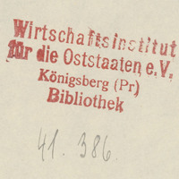 - Czerwona pieczątka: "Wirtschaftsinstitut für die Oststaaten e.V. Königsberg (Pr) Bibliothek"