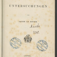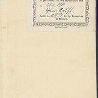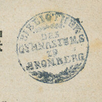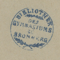 1. Pieczątka okrągła, tusz niebieski, napis częściowo w okręgu / w 5 rzędach: BIBLIOTHEK DES GYMNASIUMS ZU BROMBERG