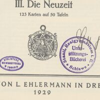 1. Granatowa, okrągła pieczątka: Staatl. Realgymnasium. Lehrer-Bibliothek. Schlawe, sygnatura odręczna zapisana ołówkiem składająca się z litery i liczb arabskich.
