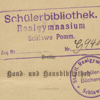 7. Biała nalepka z okrągłą, fioletową pieczątką: Staatl. Realgymnasium i. E. * Schlawe * w centrum znajduje się napis Unter-Stützungs-Bücherei ; pod pieczątką został zapisany odręcznie: rok 1937 , a pod nim czarnym tuszem numer 5468 i poniżej Ke-4; Inny przykład: rok 1936 oraz poniżej zapis Bc64b, a pod nim numer 5432