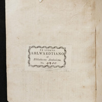 - 1. Exlibris donacyjny: Ex legato ahlwardtiano ad Bibliothecam Academicam. No. 9400. ; 2. sygnatura na ostatniej wyklejce: Ob 412 AW