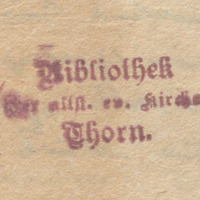 - Pieczęć podłużna: Bibliothek der altst. ev. Kirche Thorn, pieczęć okrągła z napisem w otoku: Kirchensiegel der Altstaedtschen Evangelischen Gemeinde zu Thorn i herbem Torunia w środku (k. 1r, 5r); na grzbiecie i na wyklejce górnej okładziny sygnatura „C II 8”