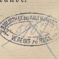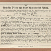- Naklejka Bibliothek-Ordnung des Rigaer Kaufmännischen Vereins ; pieczątka Bibliothek des Rigaer Kaufmännischen Vereins