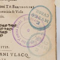 - Okrągła fioletowa pieczątka: Bibliothek des Vereins prakt. Aerzte zu Mitau; okrągła fioletowa pieczątka EX BIBLIOTH. SOC. LITER. CURON.; okrągła zielona pieczątka E MVSEO CVRON