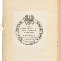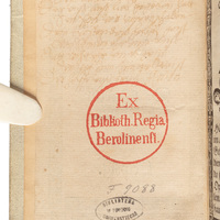 - Pieczątka okrągła (tusz czerwony) „Ex Biblioth. Regia Berolinensi.” ; sygnatura ołówkowa na przedniej wyklejce F 9088 i fragment sygn. (czarny tusz) na tylnej wyklejce ; Ekslibris donacyjny „Bibliotheca Regia Berolinensis. Dono Friderici Wilhelmi IV Regis Augustissimi D. V. Nov. MDCCCL. Ex Bibliotheca B. M. Hartw. Gregorii De Meusebach.”