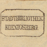 - Sygnatura: S 67. 8°. III: (wyklejka górnej okładziny); ośmioboczna pieczątka Stadtbibliothek Koenigsberg (k. 1r)