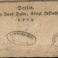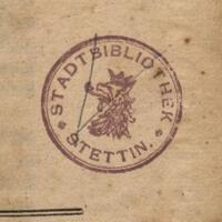 - Pieczątka owalna: POMMERSCHES MUSEUM; pieczątka okrągła: AUS DER STADTBIBLIOTHEK STETTIN; sygnatura Gh 2910