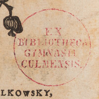 - 1. Pieczątka "Ex Bibliotheca Gymnasii Culmensis". 2. Nalepka na grzbiecie z sygnarturą.