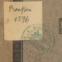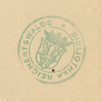 - Pieczątka okrągła: Bibliothek Reichertswalde. Naklejka (fragment) z sygnaturą, nazwą działu biblioteki oraz fragmentem pieczęci.