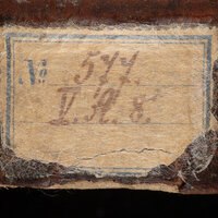 - Zapiska proweniencyjna na stronie tytułowej "Ex Libris ... ad Bibliotheca[m] Academiæ Culmensis" ; 2. Sygnatura. ; 3. Ząbkowana nalepka na dole grzbietu z wydrukowaną niebieską podwójną obwódką i wpisaną sygnaturą.