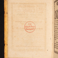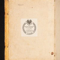 - 1. Pieczątka okrągła (tusz czerwony) „Ex Biblioth. Regia Berolinensi.” ; 2. Ekslibris donacyjny „Bibliotheca Regia Berolinensis. Dono Friderici Wilhelmi IV Regis Augustissimi D. V. Nov. MDCCCL. Ex Bibliotheca B. M. Hartw. Gregorii De Meusebach.” ; 3. Sygnatura F 9260 ; 4. Wklejony na ostatniej wyklejce wystający kartonik z sygnaturą.