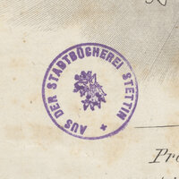 - Pieczatka owalna czerwona: Aus der Stadtbücherei Stettin; nalepkowa i ołówkowa sygnatura Mx 316