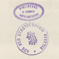 - Pieczątka: Aus der Stadtbücherei Stettin; nalepkowa i ołówkowa sygnatura Mx 1143
