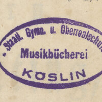 - Pieczątka: owalna fioletowa Staatl. Gymn. u. Oberrealschule Musikbücherei Köslin