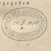 - Pieczątka owalna Bibliothek des Stadtgymnasiums Stettin oraz pieczątka pastora, kolekcjonera Friedricha Karowa (1804-1878), który przekazał zapisem testamentowym swój księgozbiór bibliotece Gimnazjum w Szczecinie.