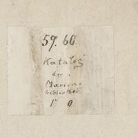 - Sygnatury: „59.60. Katalog der Marienbibliothek 1740 [?]” (naklejka na grzbiecie - obecnie na wyklejce dolnej okładziny)