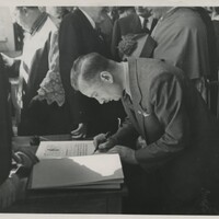 Uroczyste otwarcie Biblioteki Uniwersyteckiej w Toruniu, 10 maja 1947 r., podpisanie księgi pamiątkowej -