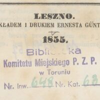 - Pieczątka na stronie tytułowej: Bibljoteka Kalksteinów. Pluskowęsy, pieczątka: Biblioteka Komitetu Miejskiego PZPR w Toruniu