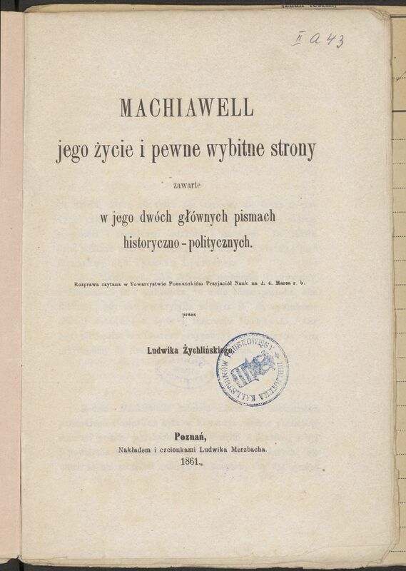 Machiawell : jego życie i pewne wybitne strony zawarte w jego dwóch głównych pismach historyczno-politycznych : rozprawa czytana w Towarzystwie Poznańskiém Przyjaciół Nauk na d. 4 marca r. b.