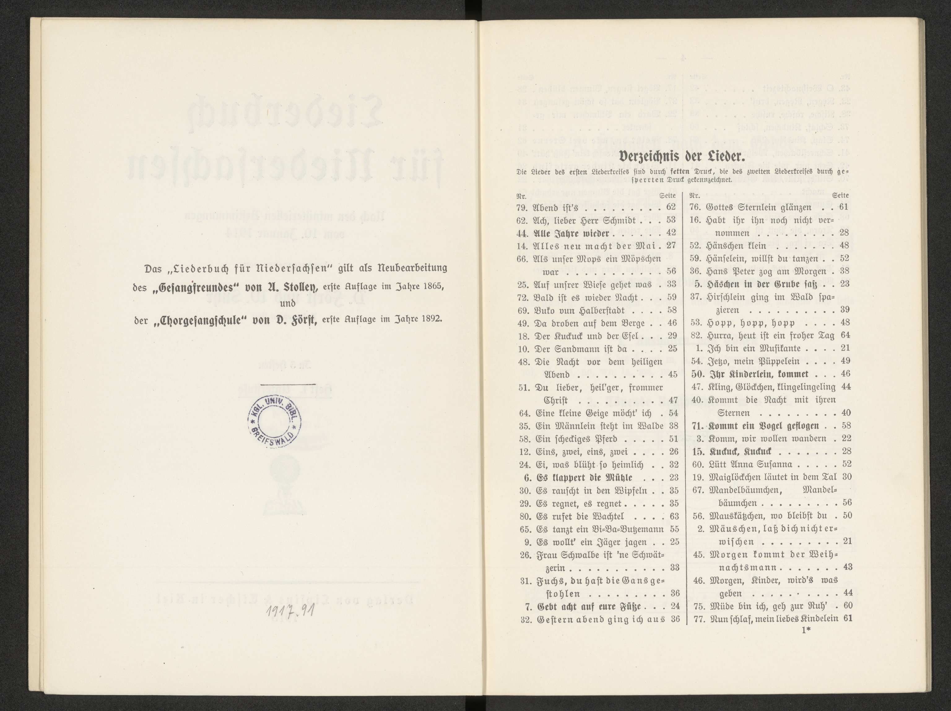 Liederbuch für Niedersachsen. H. 1, Unterstufe - s. tyt. tylna - pieczątka okragła: KGL. UNIV. BIBL. GREIFSWALD