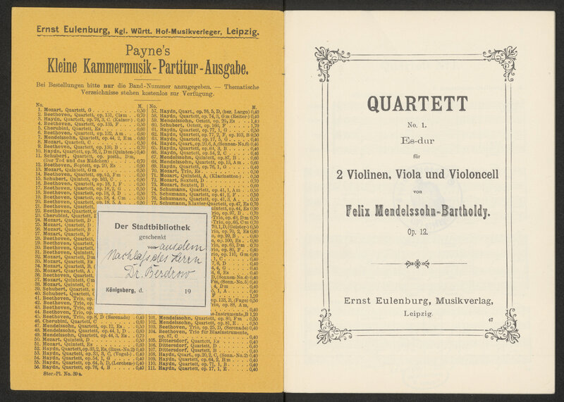 Quartet No. 1 Es-dur für 2 Violinen, Viola und Violoncell - verso okładki i s. tyt. - Naklejka donacyjna: Der Stadtbibliothek geschenkt aus dem Nachlass des Herrn Dr. Berdrow . Königsberg, d. 19/2