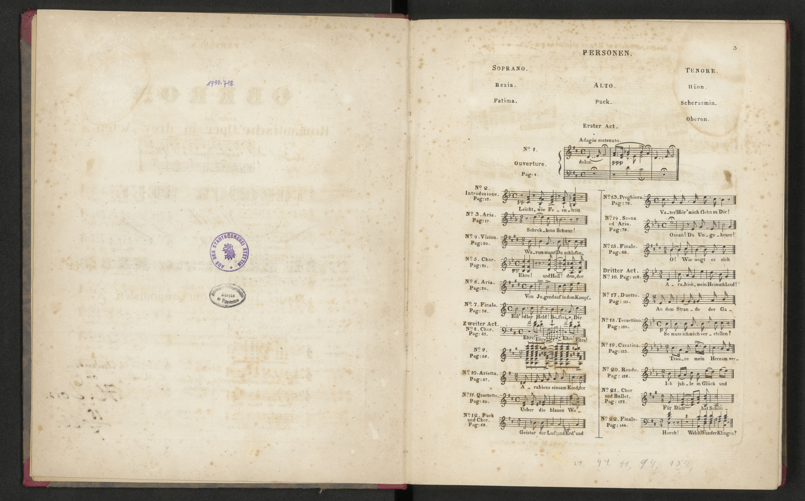 Oberon. Romantische Oper in drey Acten. Nach dem englischen des J. Planché von Theodor Hell - strona tytułowa verso + strona sąsiadująca - pieczątka: Aus der Stadtbücherei Stettin
