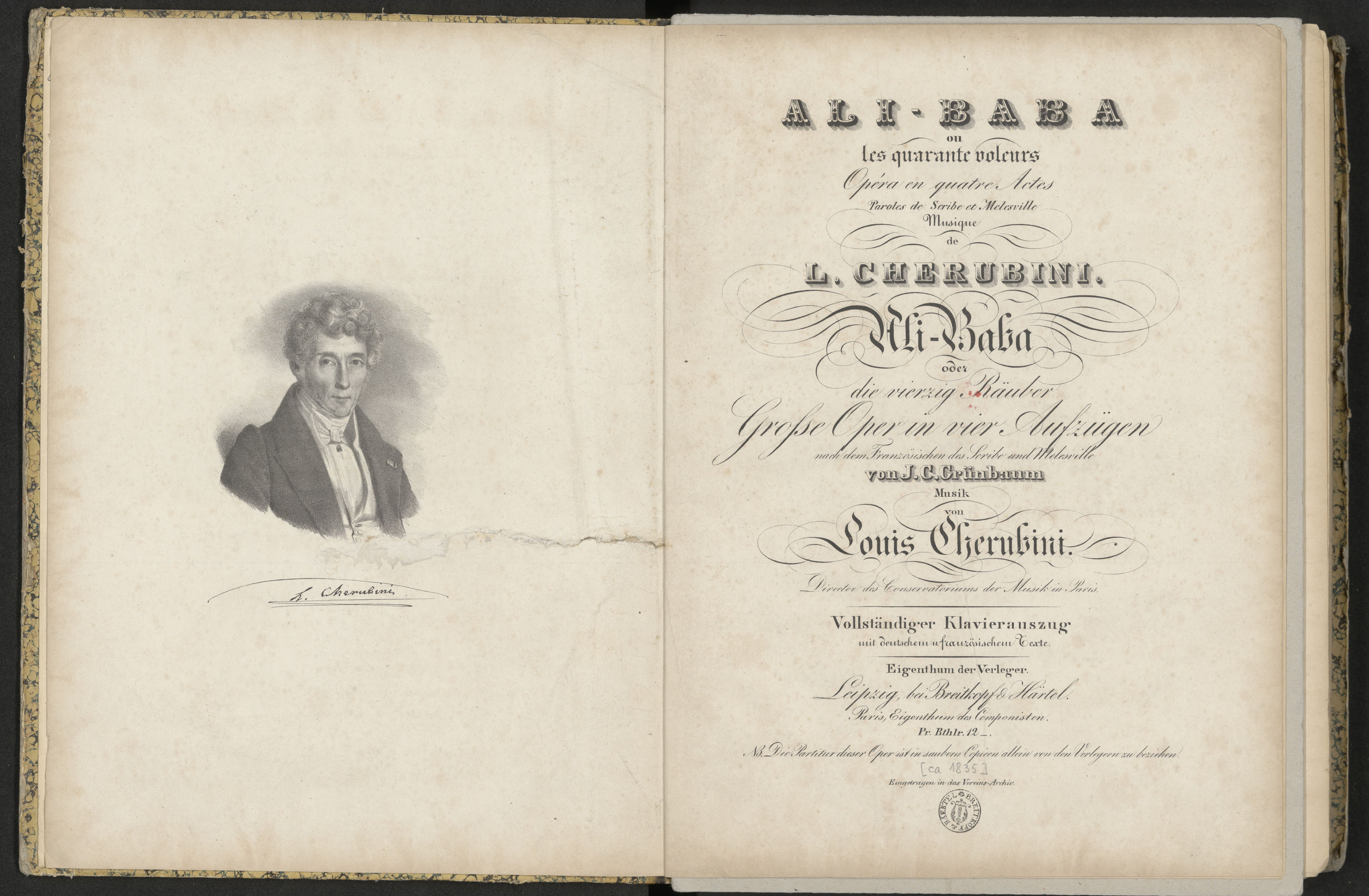 Ali - Baba oder die vierzig Räuber. Grosse Oper in vier Aufzügen nach dem französischen des Scribe und Melesville von J. C. Grünbaum - karta ochronna verso z port. kompozytora i strona tytułowa recto