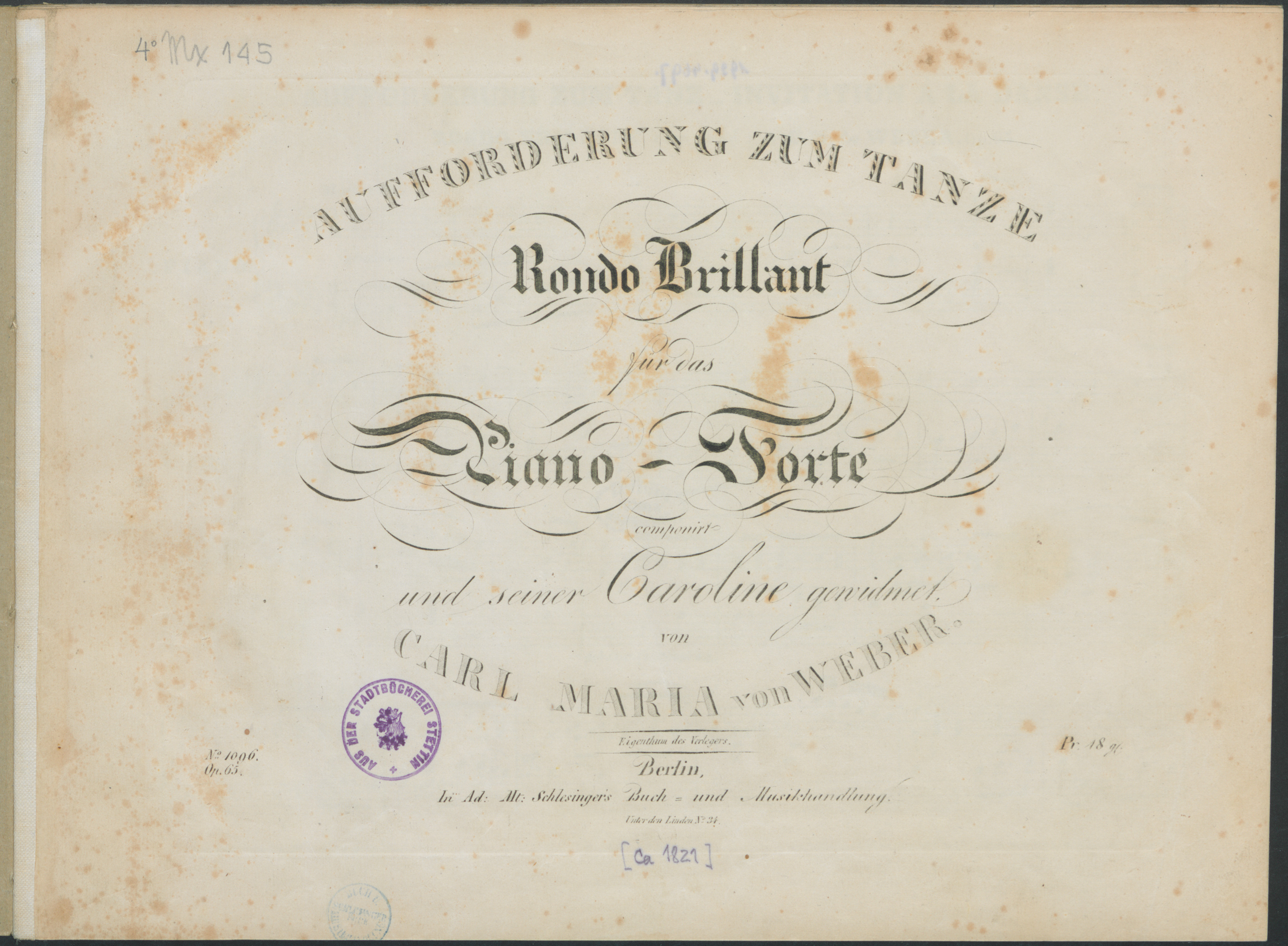 Aufforderung zum Tanze. Rondo brillant für das Piano-Forte : Op. 65 - strona tytułowa - pieczątka okrągła: Aus der Stadtbücherei Stettin - sygnatura i format ołówkiem: 4° Mx 145