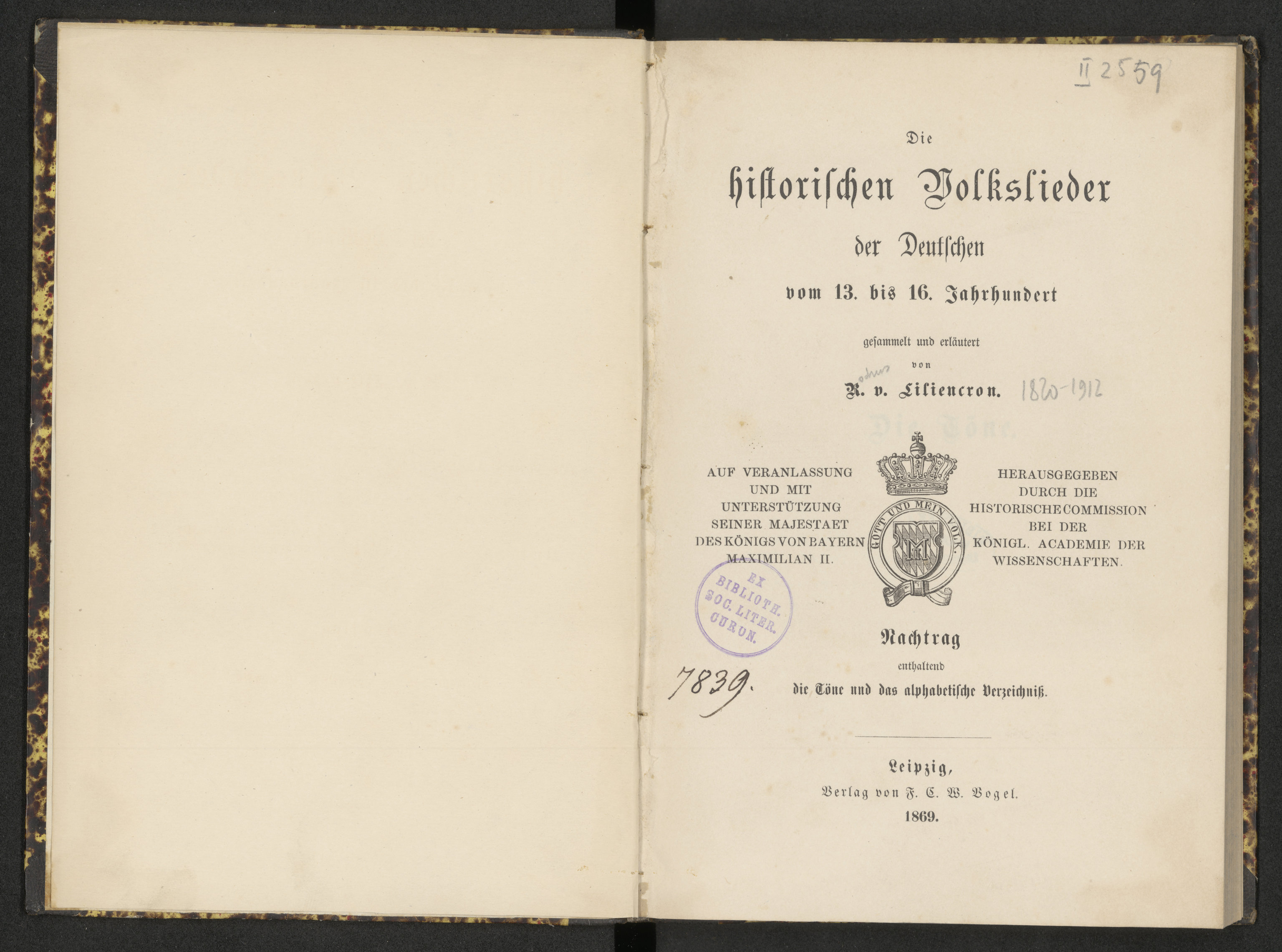 Part of Die historischen Volkslieder der Deutschen im 13. bis 16. Jahrhundert. Nachtrag enthaltend die Töne und das alphabetische Verzeichniss