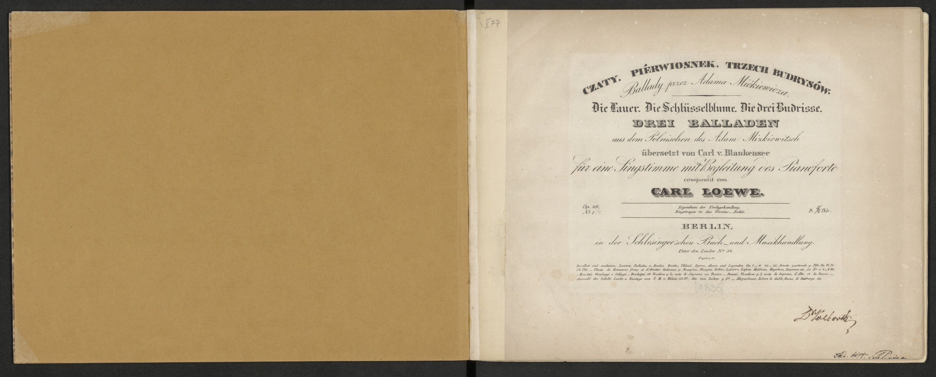 Part of Czaty. Pierwiosnek. Trzech Budrysów. Ballady przez Adama Mickiewicza = Die Lauer. Die Schlüsselblume. Die drei Budrisse. Drei Balladen aus dem polnischen des Adam Mizkiewitsch übersetzt von Carl von Blankensee für eine Singstimme mit Begleitung des Pianoforte : op. 49