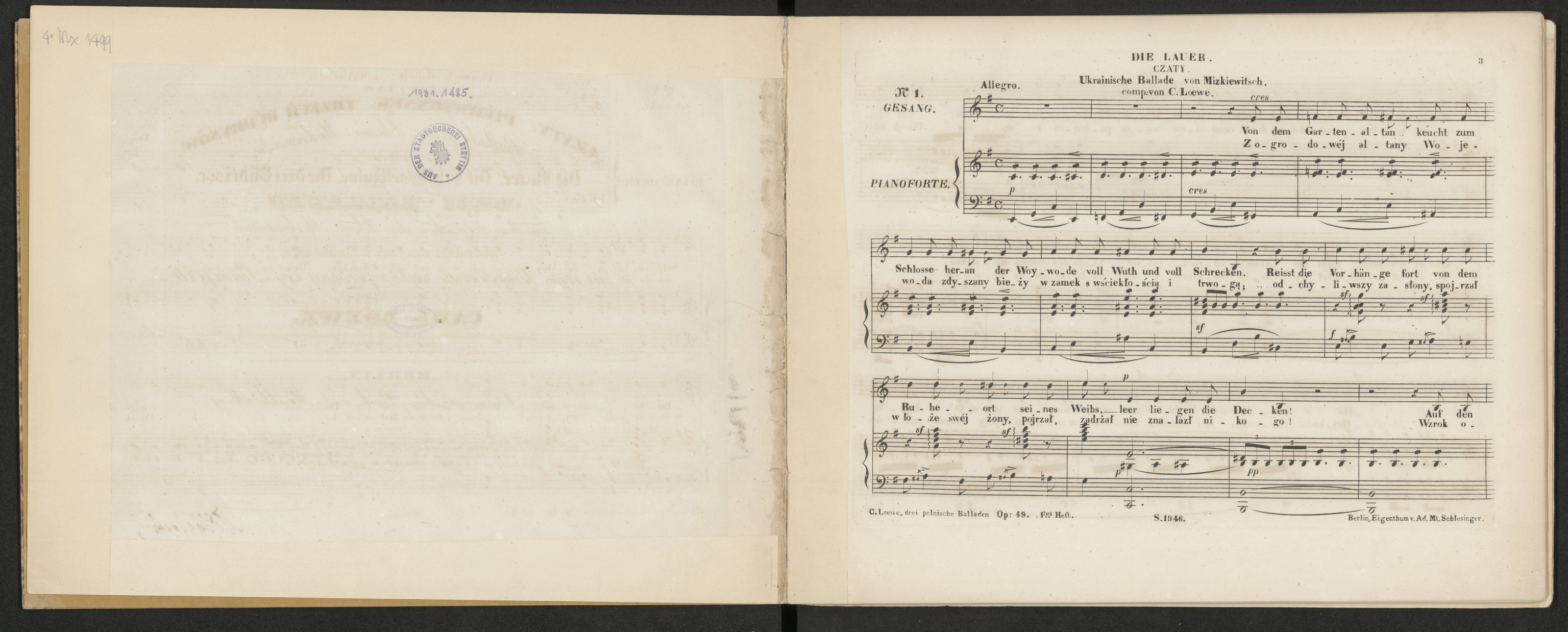Czaty. Pierwiosnek. Trzech Budrysów. Ballady przez Adama Mickiewicza... - karta tytułowa verso i strona 3 z okrągłą pieczęcią: Aus der Stadtbücherei Stettin