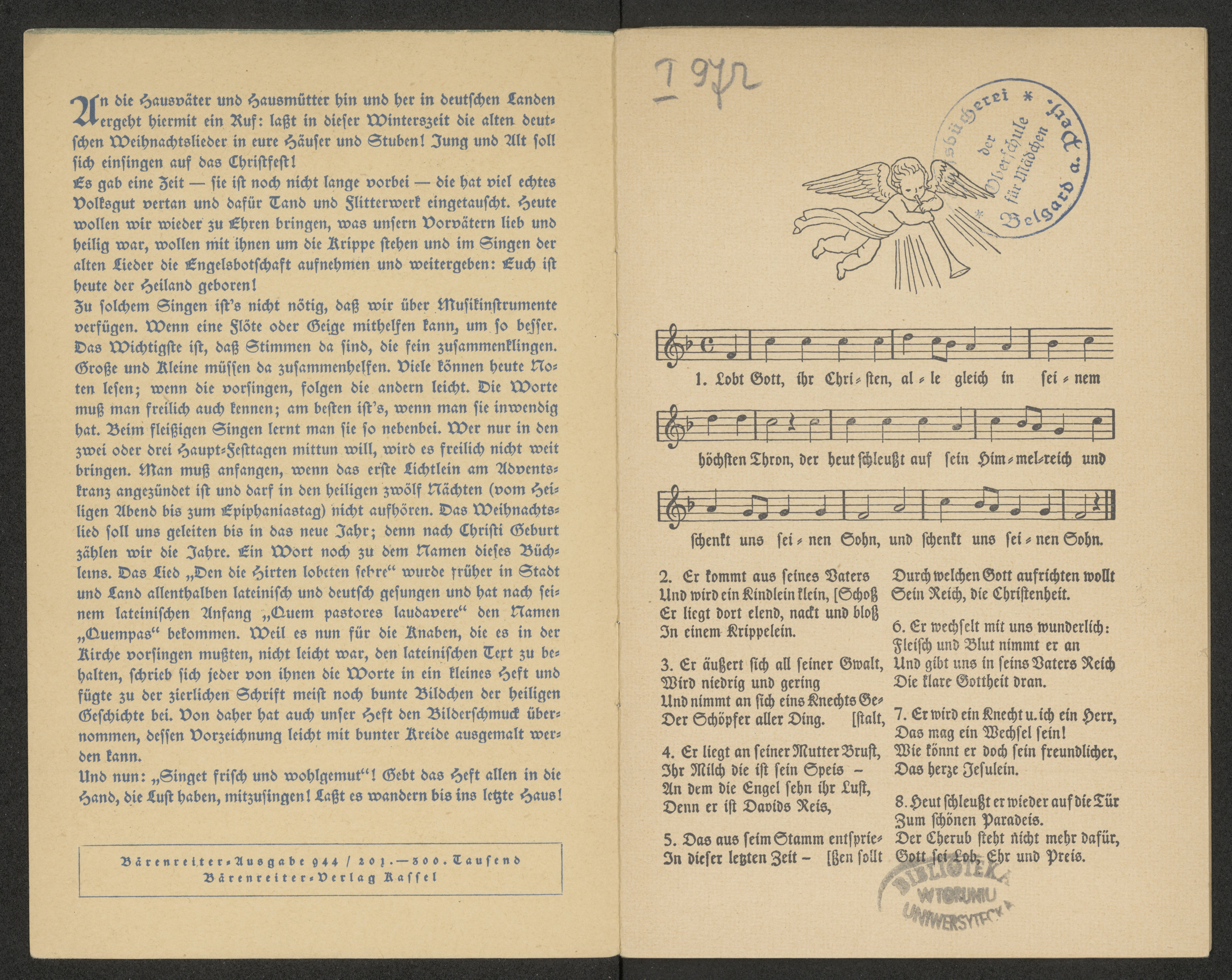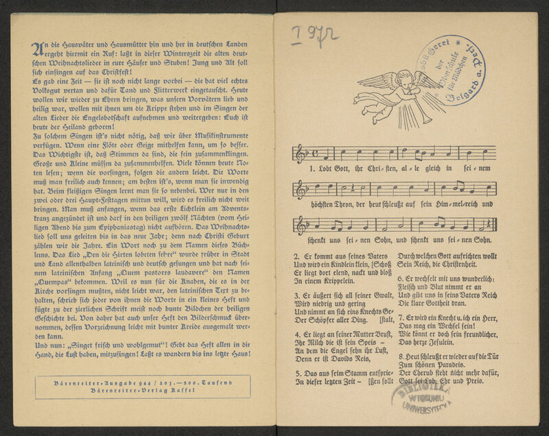 Weihnachtslieder fürs deutsche Haus. Das kleine Quempas=Heft - strona [1] z pieczątką okrągłą: Hilfsbücherei der Oberschule für Mädchen Belgard a. Pers.