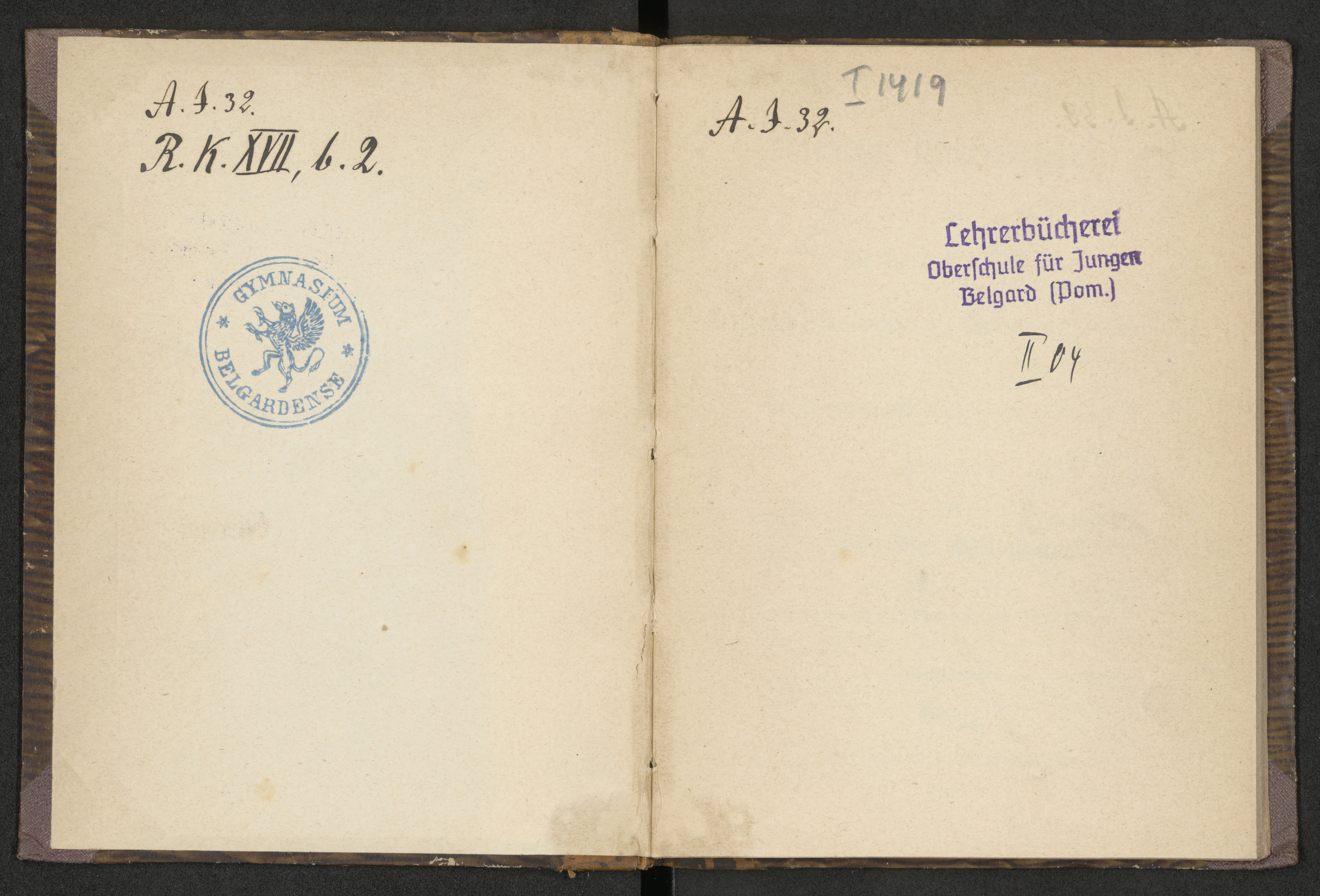 Kleine Gesanglehre für die Hand der Schüler... - wyklejka górnej okładziny z pieczatką: GYMNASIUM BELGARDENSE oraz 1 karta dodana recto z prostokątną fioletową pieczątką: Lehrerbücherei Oberschule für Jungen Belgard (Pom.)