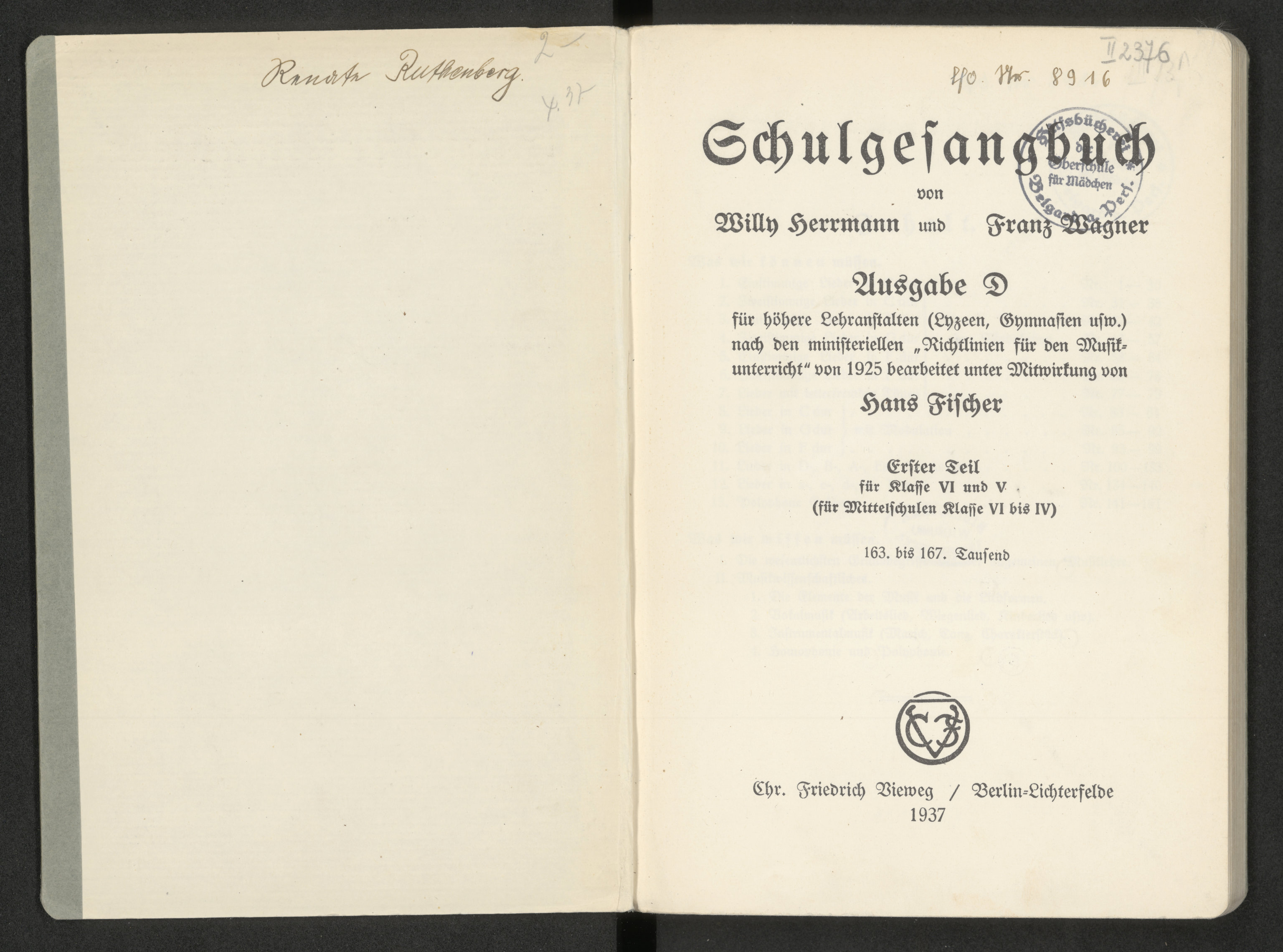 Schulgesangbuch. Ausgabe D für höhere Lehranstalten - wyklejka przedniej okladziny z wpisem własnościowym: Renate Ruthenberg i strona tytułowa z czarną okrągłą pieczątką: Hilfsbücherei der Oberschule für Mädchen Belgard a. Pers.