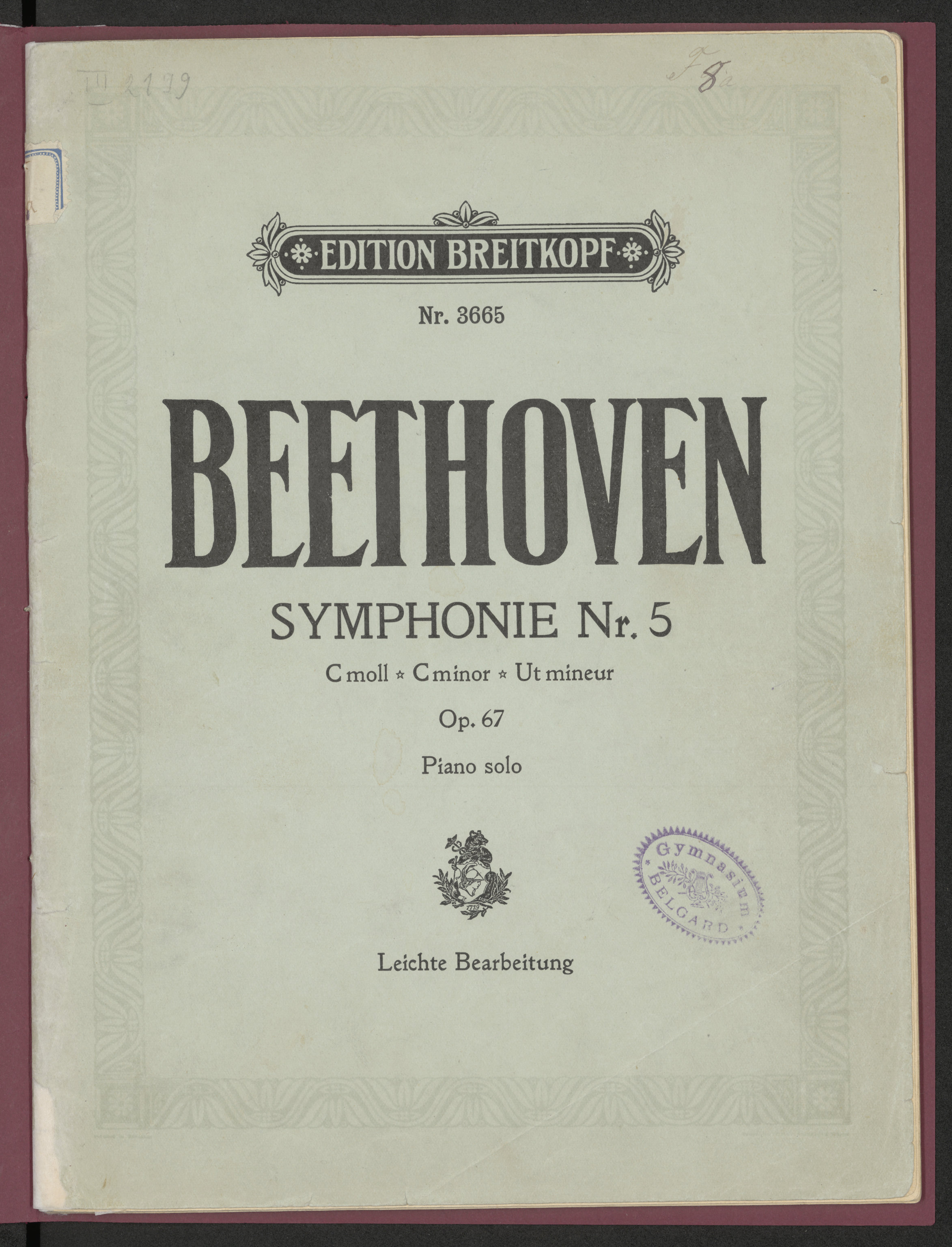 Fünfte Symphonie Op. 67 - karta tytułowa z pieczątką: Gymnasium Belgard