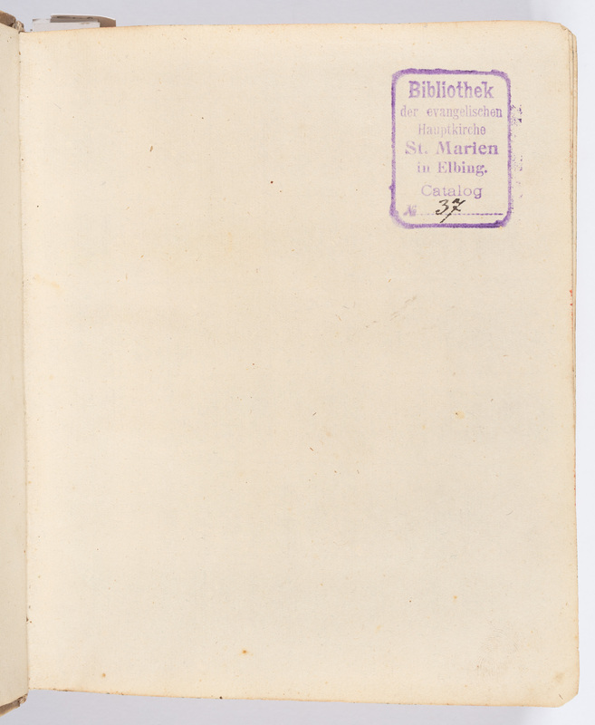1. Pieczęć prostokątna fioletowa: Bibliothek der evangelischen Hauptkirche St. Marien in Elbing. Catalog No ...z wpisanym odręcznie czarnym tuszem numerem katalogowym