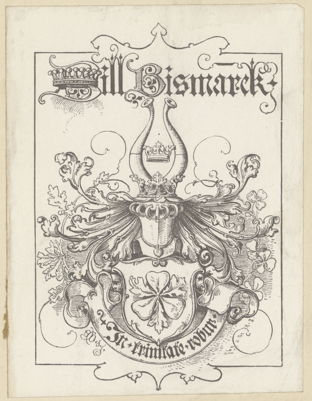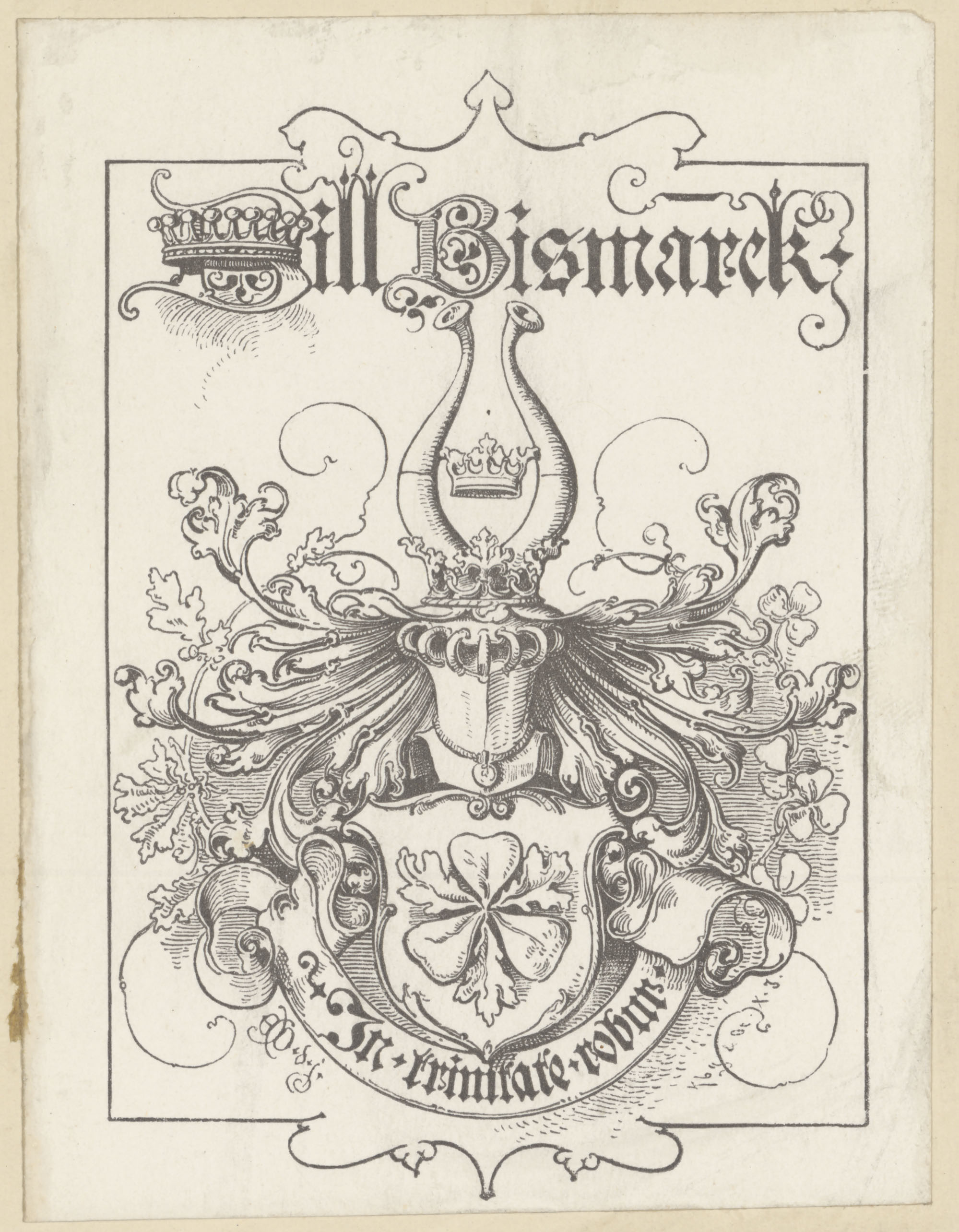 3. Ekslibris Wilhelma „Billa” von Bismarcka (1852-1901), syna kanclerza Ottona von Bismarcka: czarno-biały prostokątny ekslibris z herbem Bismarcków i dewizą In trinitate robur; na górze ekslibrisu napis Bill Bismarck, pierwsze B ujęte w koronę
