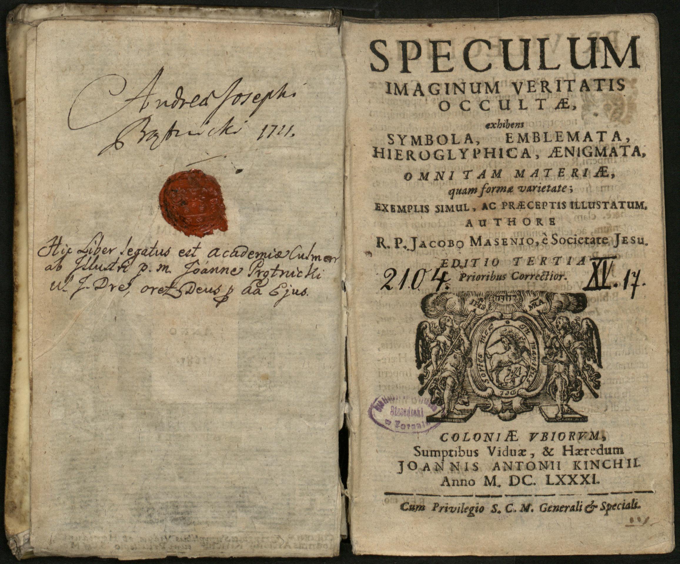 Speculum Imaginum Veritatis Occultae, exhibens Symbola, Emblemata, Hieroglyphica, Aenigmata, Omni Tam Materiae, quam formae varietate, Exemplis Simul, Ac Praeceptis Illustratum - Speculum Imaginum Veritatis Occultae, exhibens Symbola, Emblemata, Hieroglyphica, Aenigmata, Omni Tam Materiae, quam formae varietate, Exemplis Simul, Ac Praeceptis Illustratum - Speculum Imaginum Veritatis Occultae, exhibens Symbola, Emblemata, Hieroglyphica, Aenigmata, Omni Tam Materiae, quam formae varietate, Exemplis Simul, Ac Praeceptis Illustratum - zapiska własnościowa, zapiska donacyjna - na stronie tytułowej odręczna sygnatura: 2104.XV.17