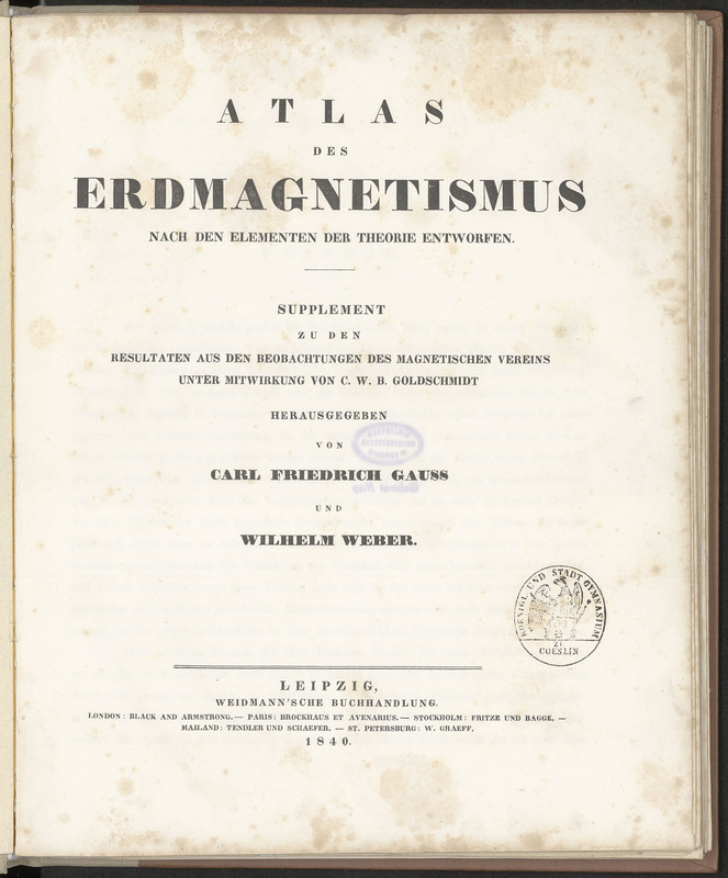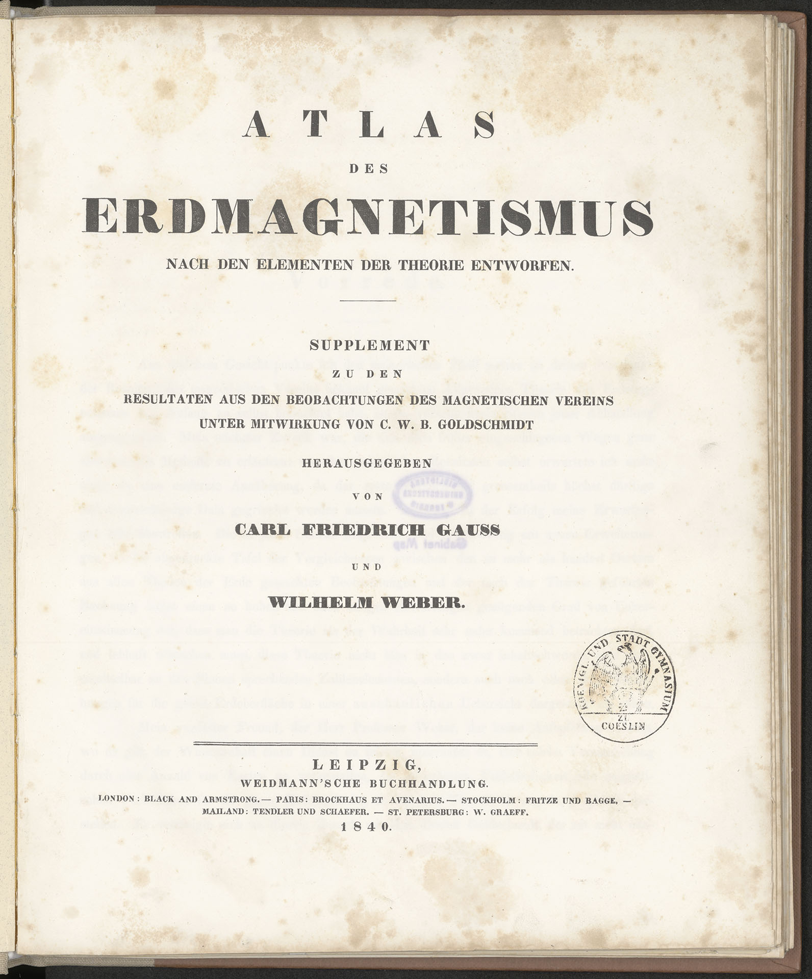 Atlas des Erdmagnetismus nach den Elementen der Theorie entworfen : Supplement zu den Resultaten aus den Beobachtungen des Magnetischen Vereins unter Mitwirkung von C. W. Goldschmidt - strona tytułowa z pieczątką: KOENIGL. UND STADT GYMNASIUM ZU COESLIN