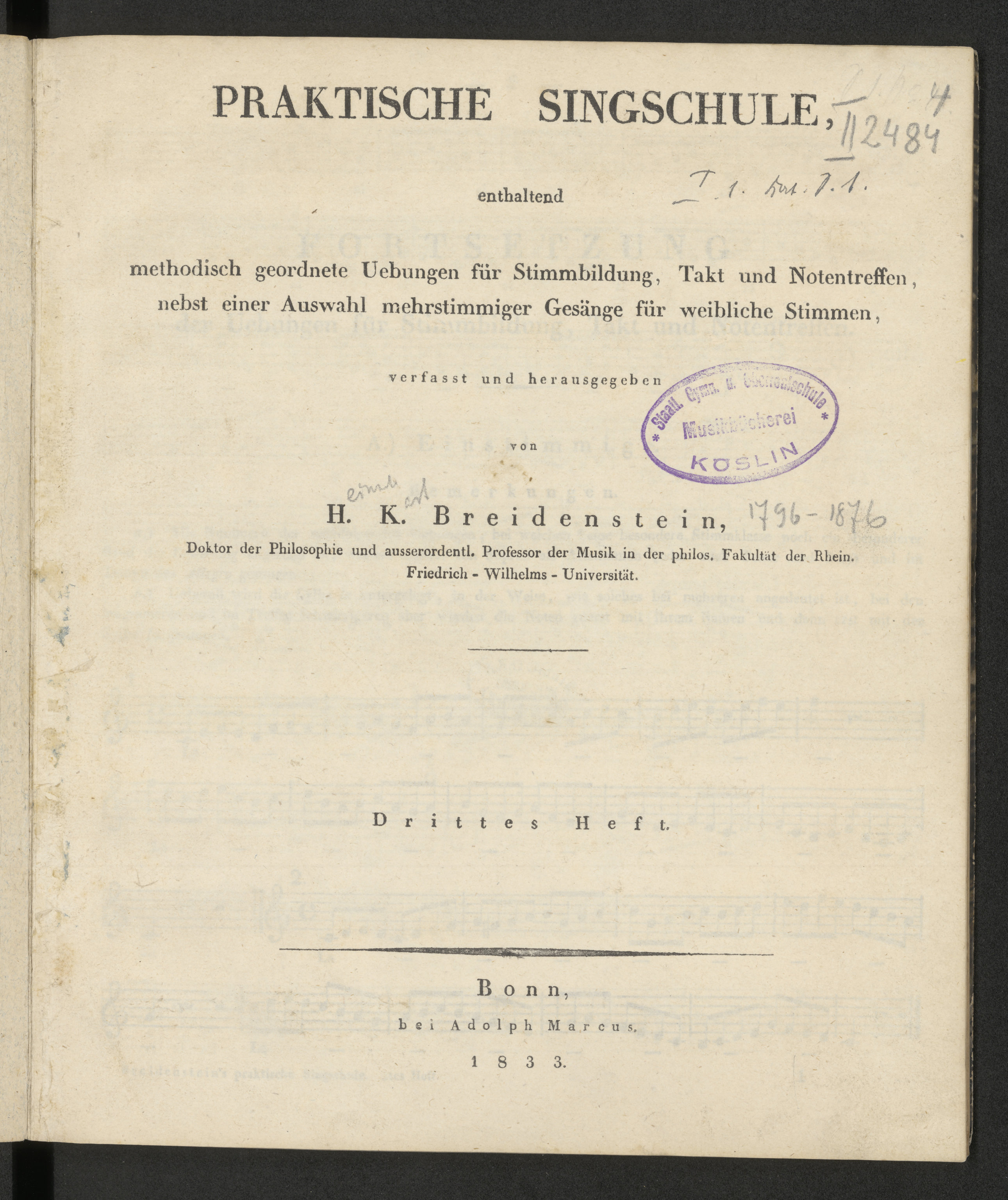 Praktische Singschule, enthaltend metodisch geordnete Uebungen für Stimmblidung, Takt und Notentreffen, nebst einer Auswahl mehrstimmiger Gesänge für weibliche Stimme. H. 3 - strona tytułowa z owalną pieczęcią fioletową: Staatl. Gymn. u. Oberrealschule Musikbücherei Köslin