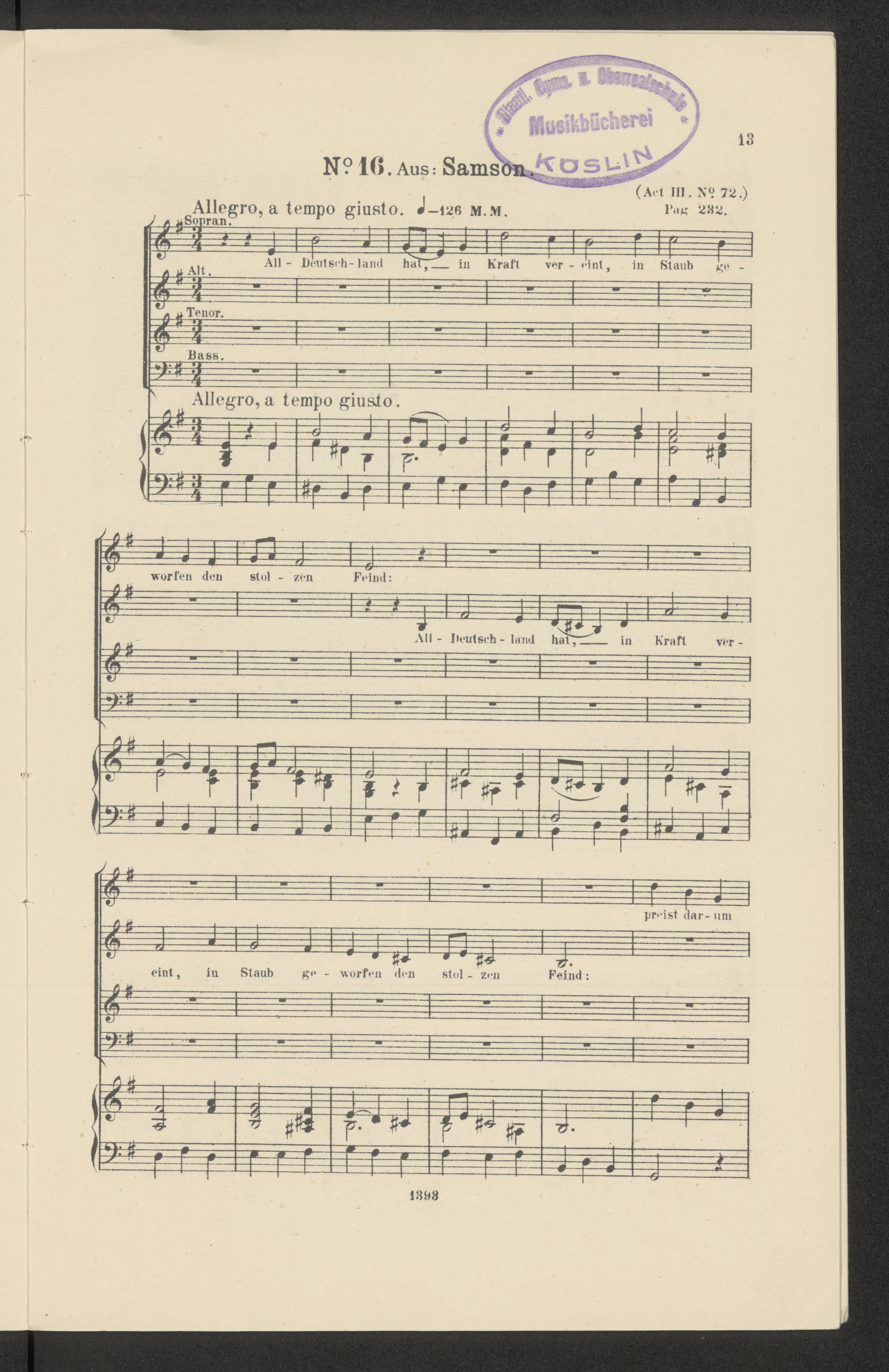 Gesänge für gemischten Chor mit Klavierbegleitung aus den Oratorien. [Lfg. 3] - strona 13 z owalna pieczatką fioletową: Staatl. Gymn. u. Oberrealschule Musikbücherei Köslin