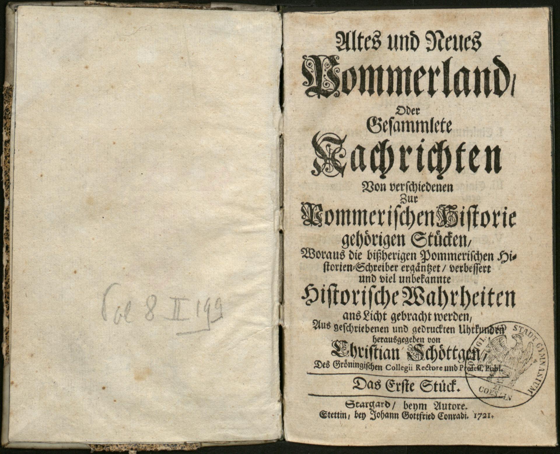 Altes und Neues Pommerland, Oder Gesammlete Nachrichten Von verschiedenen Zur Pommerischen Historie gehörigen Stücken - strona tytułowa z pieczątką owalną: Koenigl. und Stadt Gymnasium zu Coeslin;