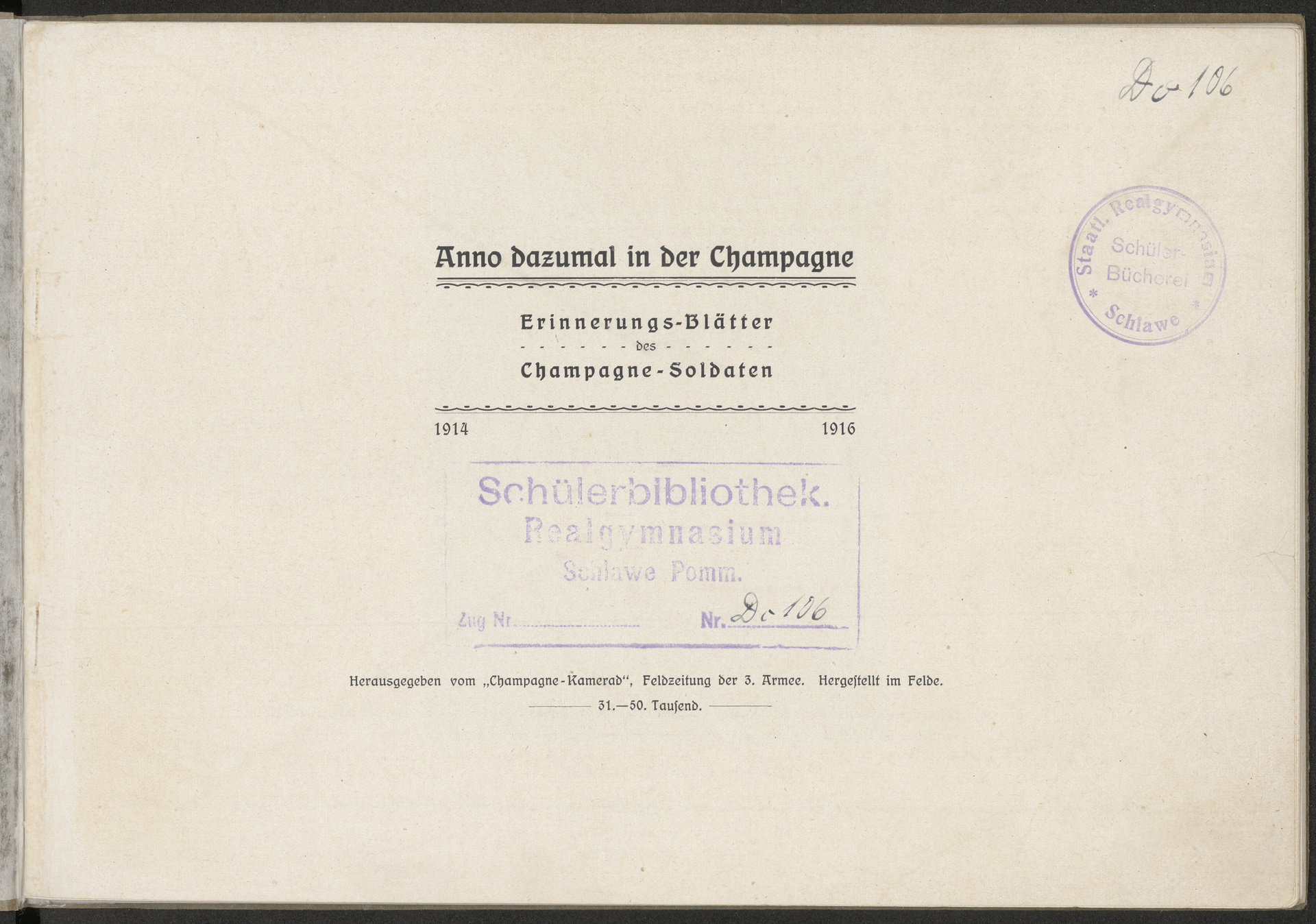 Anno Dazumal in der Chapagne. Erinnerungs-Blätter des Champagne-Soldaten, 1914-1916 - strona tytułowa wraz z pieczątkami