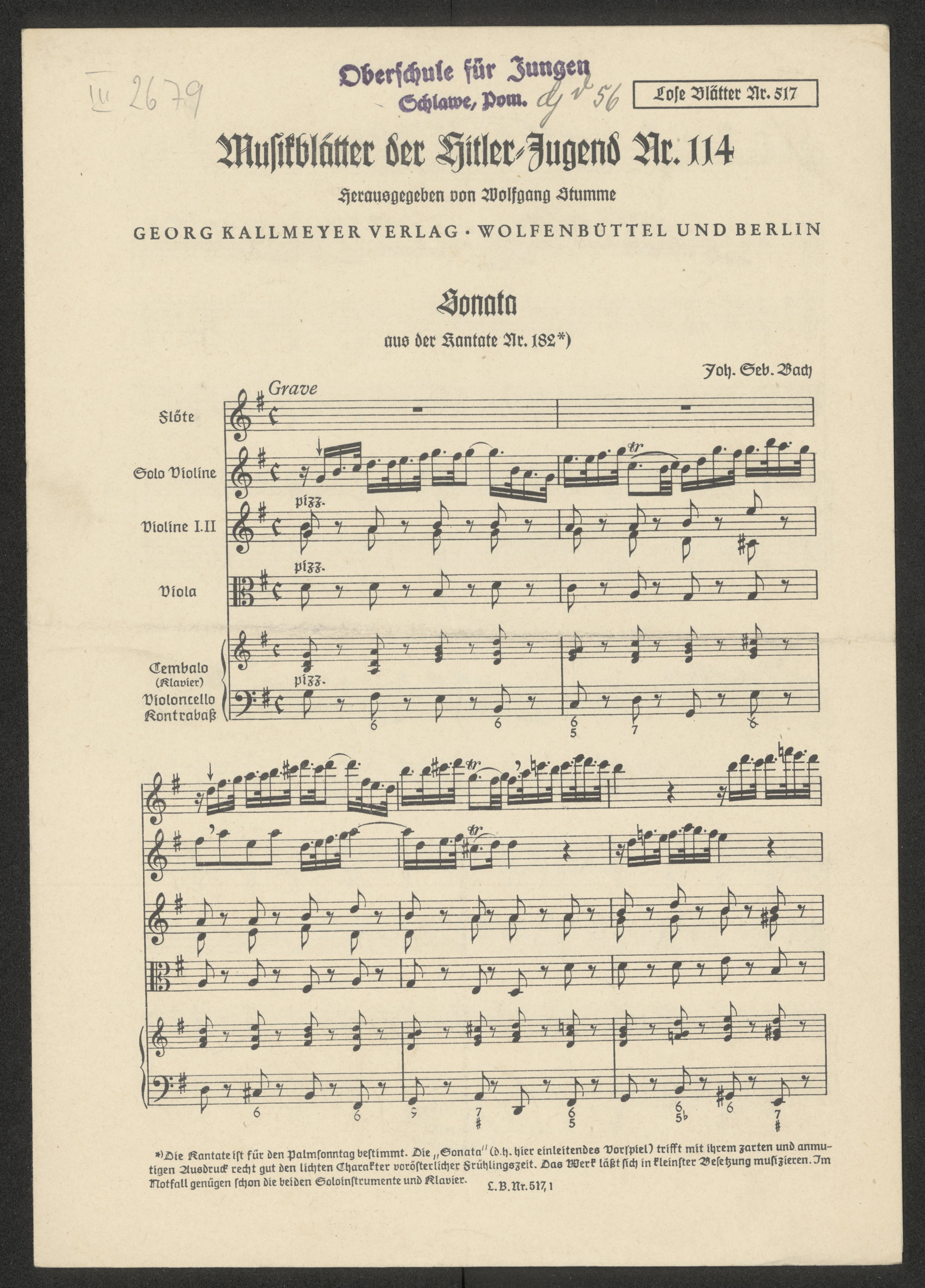 Sonata aus der Kantata Nr. 182 [Himmelskönig, sei willkommen BWV 182] - strona [1] z pieczątką: Oberschule für Jungen Schlawe, Pom.